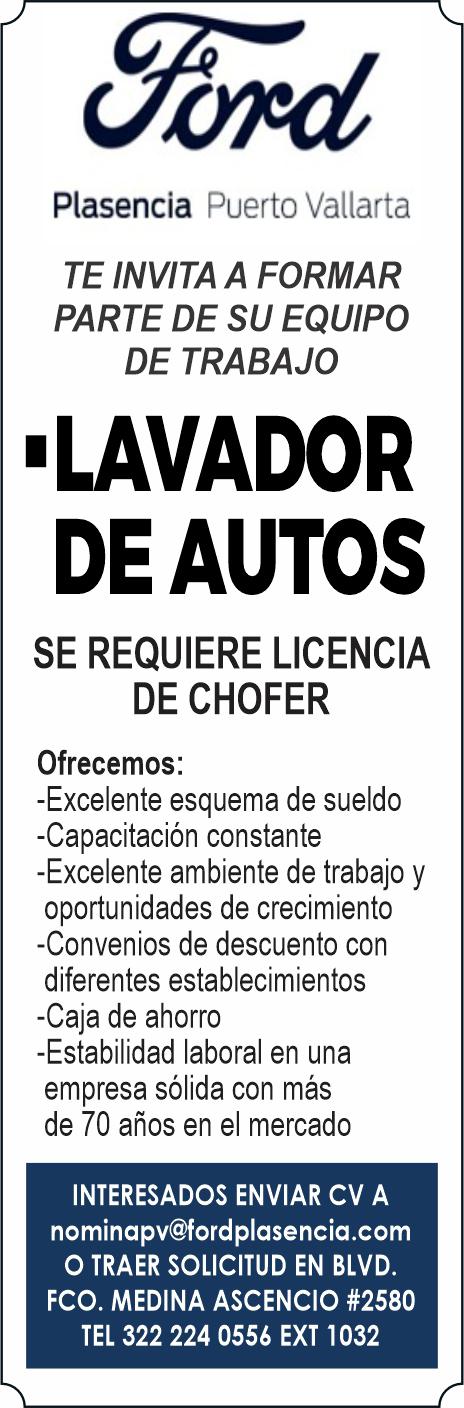 Grupo Plasencia: Solicitamos asesor de ventas en seminuevos, asesor de ventas autofinanciamiento, técnico, lavador pulidor, hojalatero, office boy. Informes al tel. 322 22 619-99.+