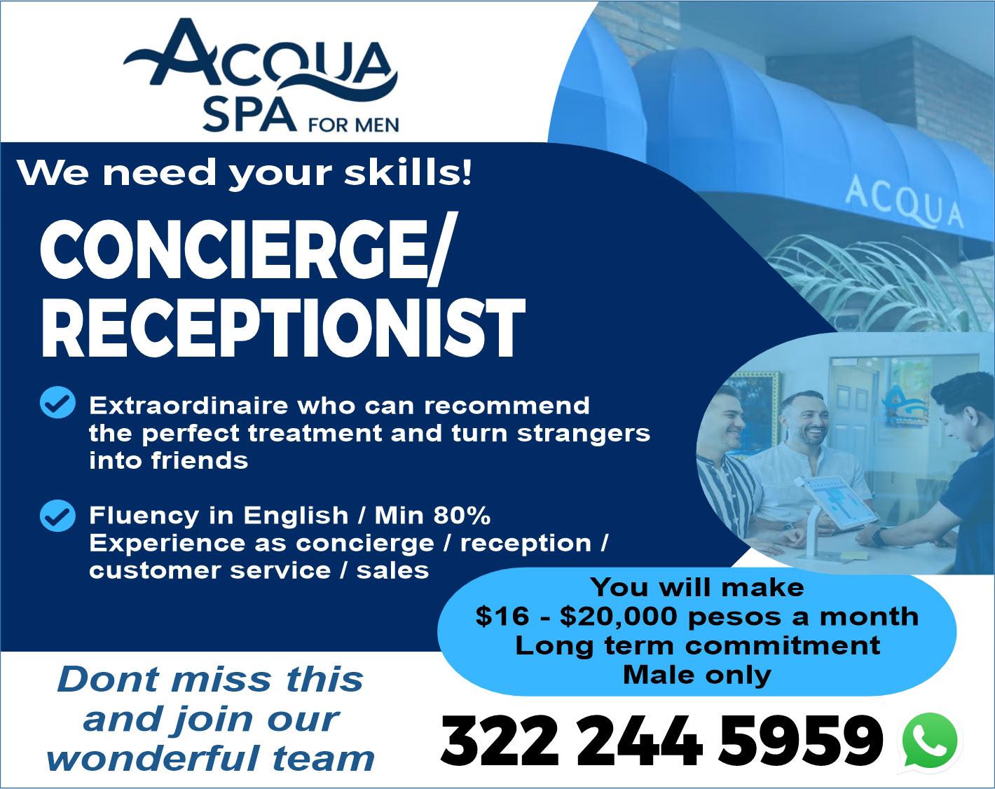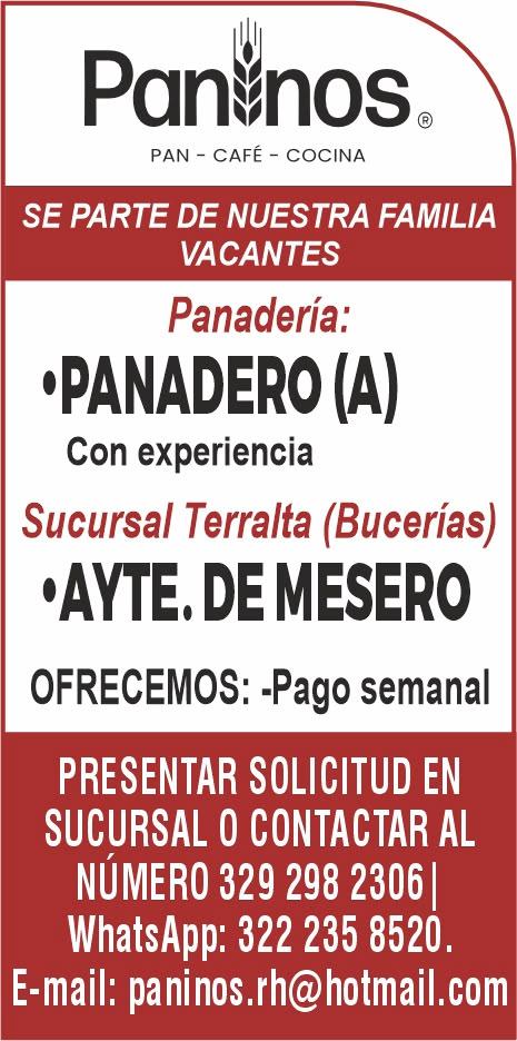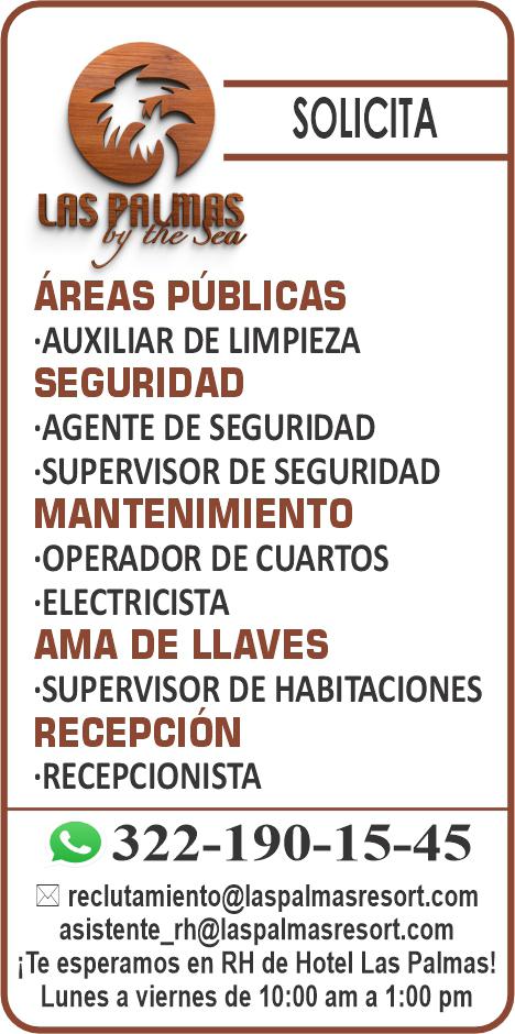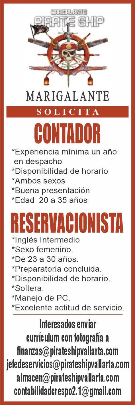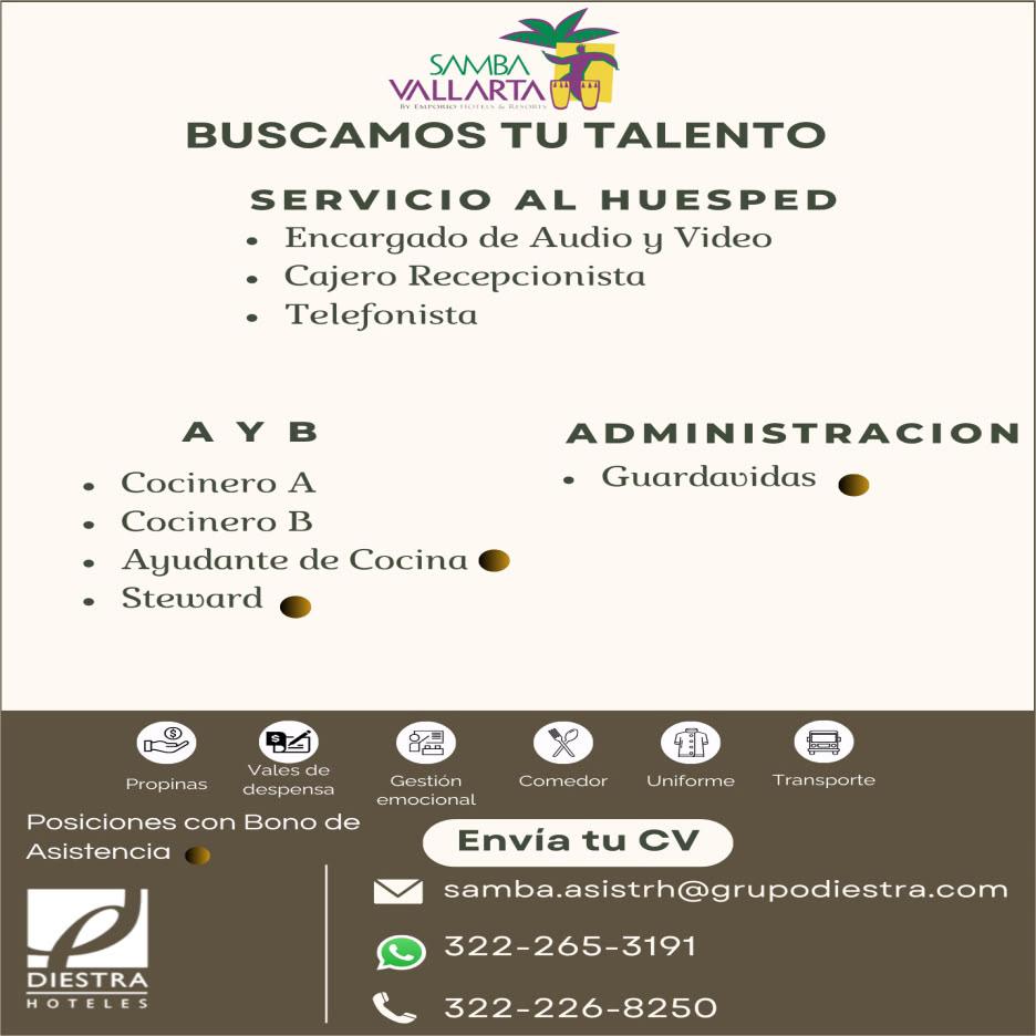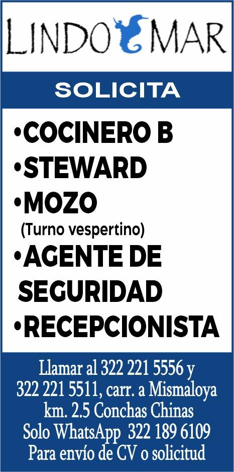 Buscamos para zona Conchas Chinas: Cocinero B, Steward, Mozo (turno vespertino), Agente de Seguridad, Recepcionista. Llama al. 322 22 155-56, 322 22 155-11.+