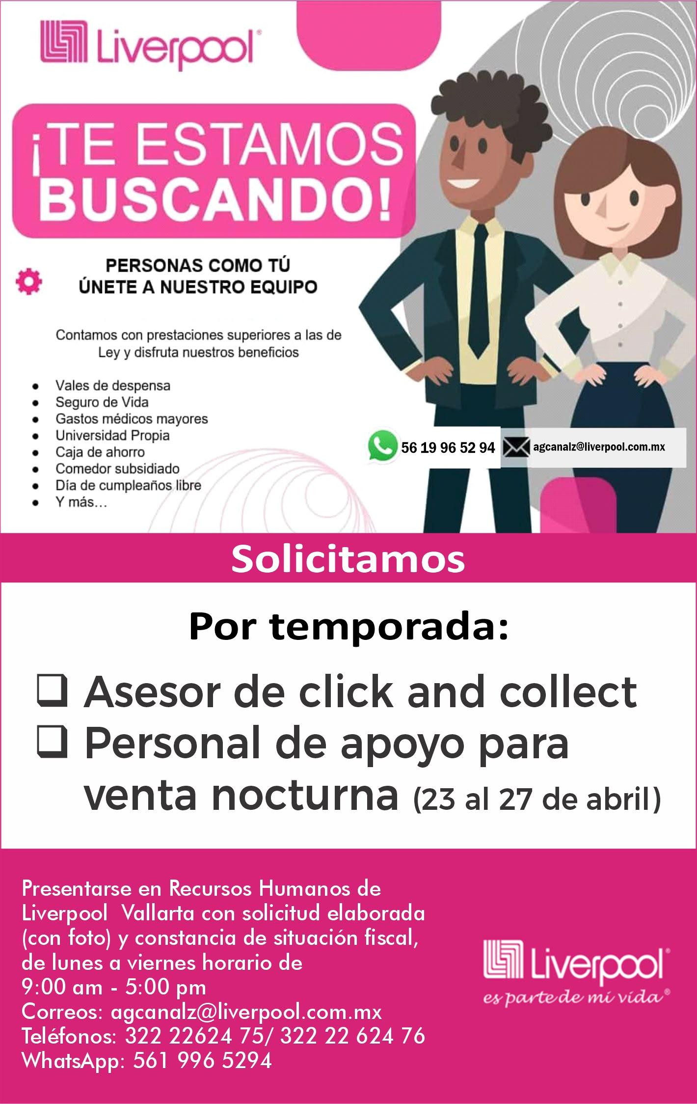 Solicitamos asesor de click and collect, personal de apoyo para venta nocturna (23 al 27 de abril). Pide cita a RH, de 9am a 5pm al tel. 322 21 666-26.+