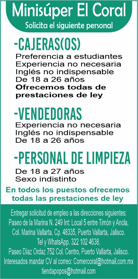 Minisúper solicita personal de limpieza, de 18 a 27 años. WhatsApp. 322 10 246-38.+