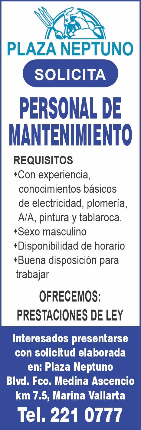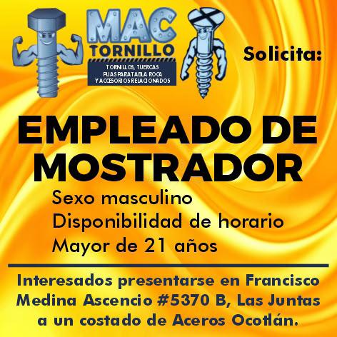 bilidad de horario, mayor de 21 años. Interesados presentarse con solicitud elaborada en Mactornillo, Francisco Medina Ascencio # 5370 B, Las Juntas a un lado de Aceros Ocotlán.