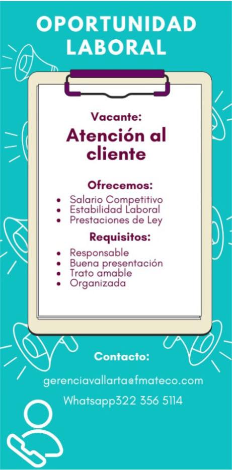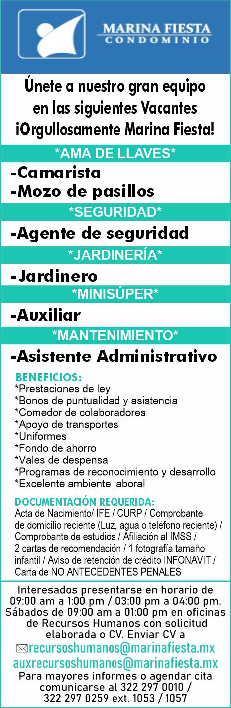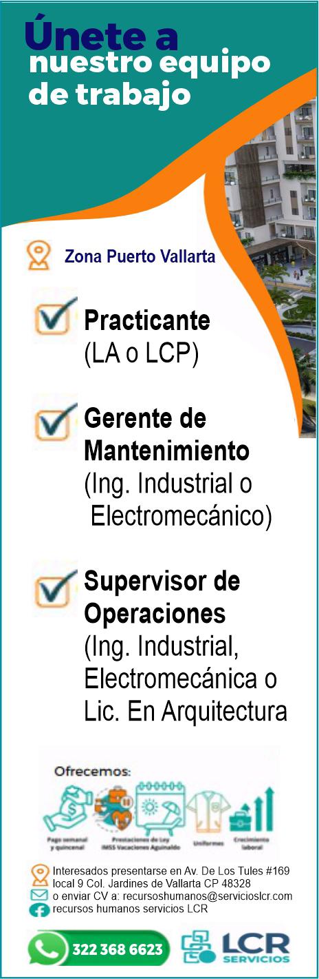 Estamos solicitando en diferentes áreas Administrativas, Operativas y de Servicios, muchas vacantes. Interesados acudir a Av. de Los Tules N. 169, col. Jardines Vallarta.