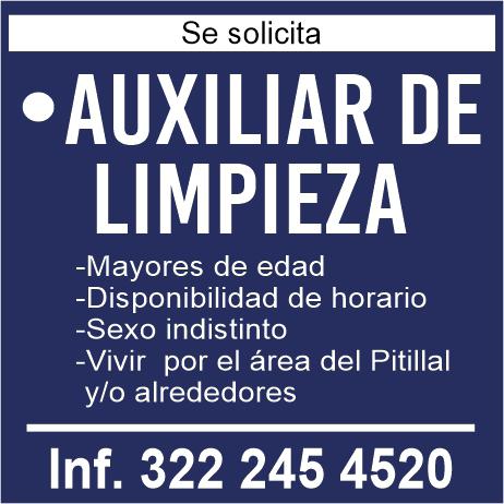 Se solicita auxiliar de limpieza, sexo indistinto, área Vallarta, disponibilidad de horario, mayores de edad. Inf. 322 13 669-