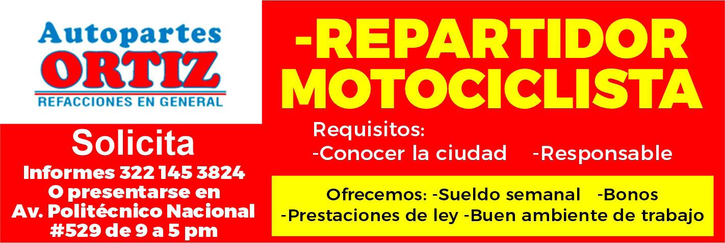 Se solicita repartidor motociclista, ofrecemos sueldo semanal, bonos, prestaciones de ley. Interesados llamar tel. 322 14