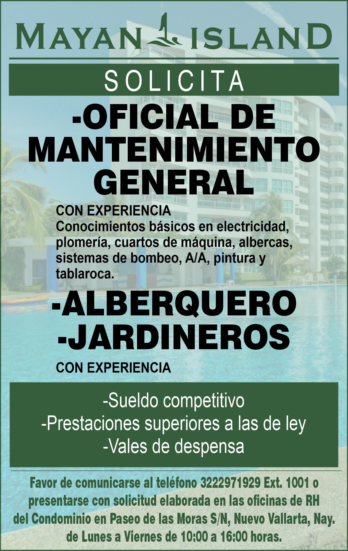 miento General con experiencia, conocimientos básicos en electricidad, plomería, cuartos de máquina, albercas, siste-