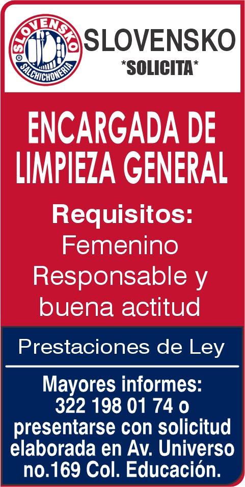Salchichería solicita encargada de limpieza general, sexo femenino. Mayores informes. 322 19 801-74.+
