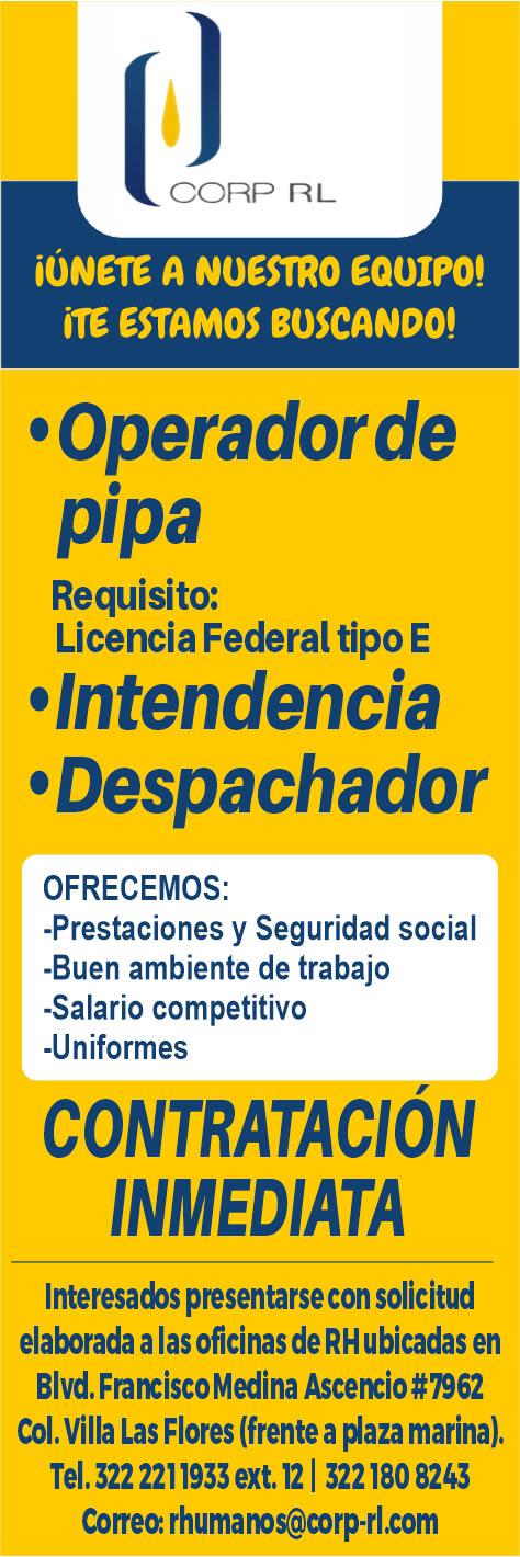 Estamos buscando operador de pipa, intendencia. Contratación inmediata. Interesados al tel. 322 22 119-33.+
