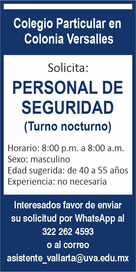 Colegio Particular en Vallarta solicita personal de seguridad, turno nocturno, horario de 8 pm a 8 am, de 40 a 55 años, experiencia no necesaria. Interesados llamar al. 322 26 245-93.+