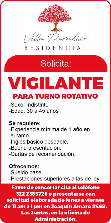Se solicita vigilante para turno rotativo, edad de 30 a 45 años, sexo indistinto, experiencia mínimo 1 año en ramo, inglés bá-
