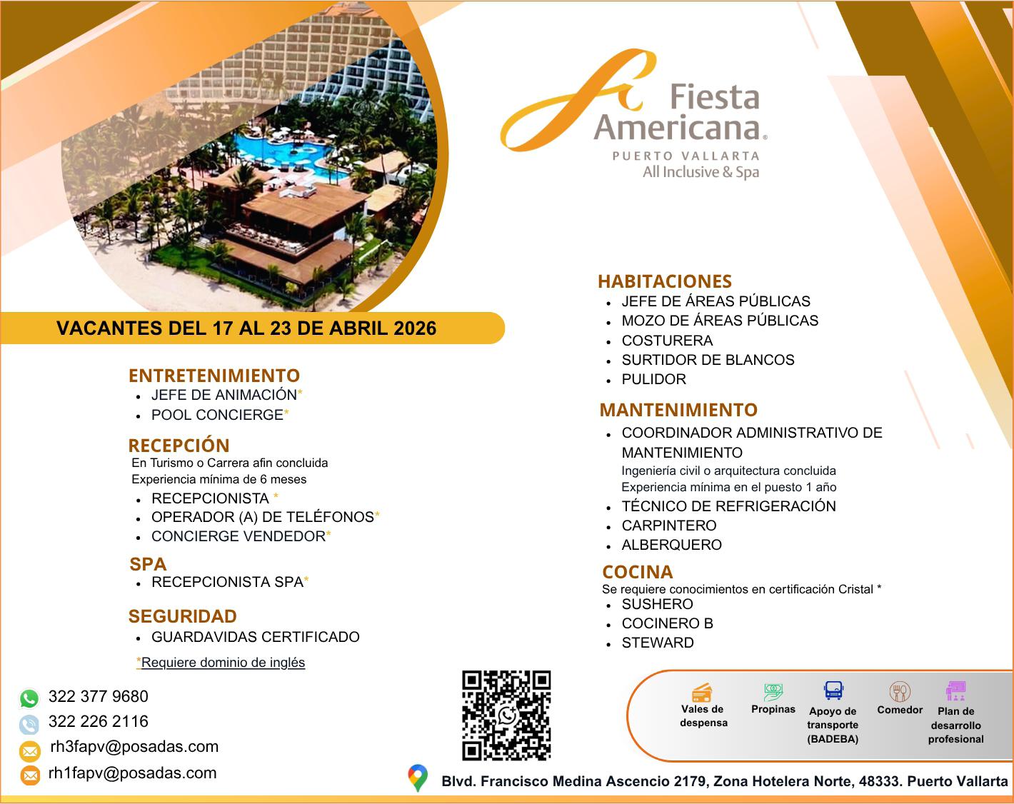 Humanos, Recepcionista, Jardinero, Mantenimiento y Lavandería. Interesados enviar currículum a: vacantespv@hotmail. com