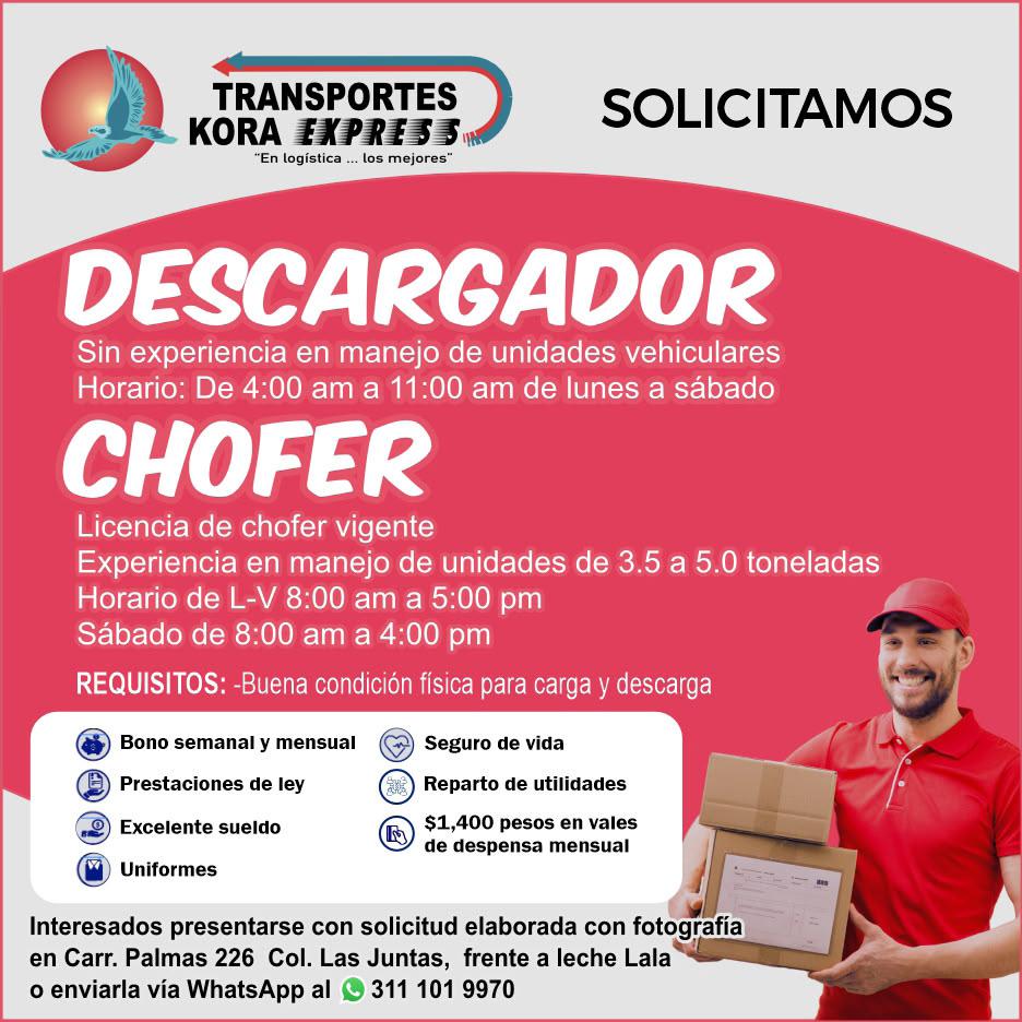 experiencia en manejo de unidades vehiculares, horario de 4 am a 11 am de lunes a sábado. Inf. 311 10 199-70.+