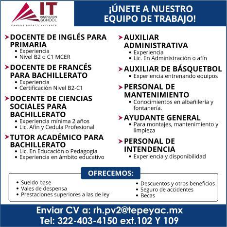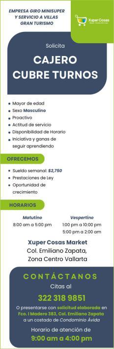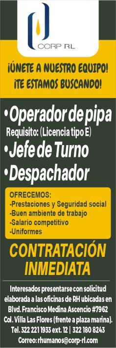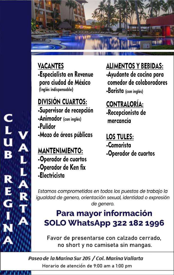 cepción: Inglés requerido, Licencia de manejo. Comunícate por WhatsApp a los números. 322 11 894-42, 322 12 59810.+