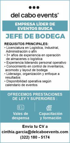 cita jefe de bodega, requisitos mínimos, Lic. en Logística y experiencia mínima de 3 años en el puesto. Envía tu CV a cinthia.garcia@delcaboevents. com tel. 322 18 051-74.+