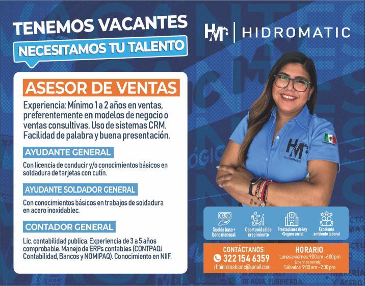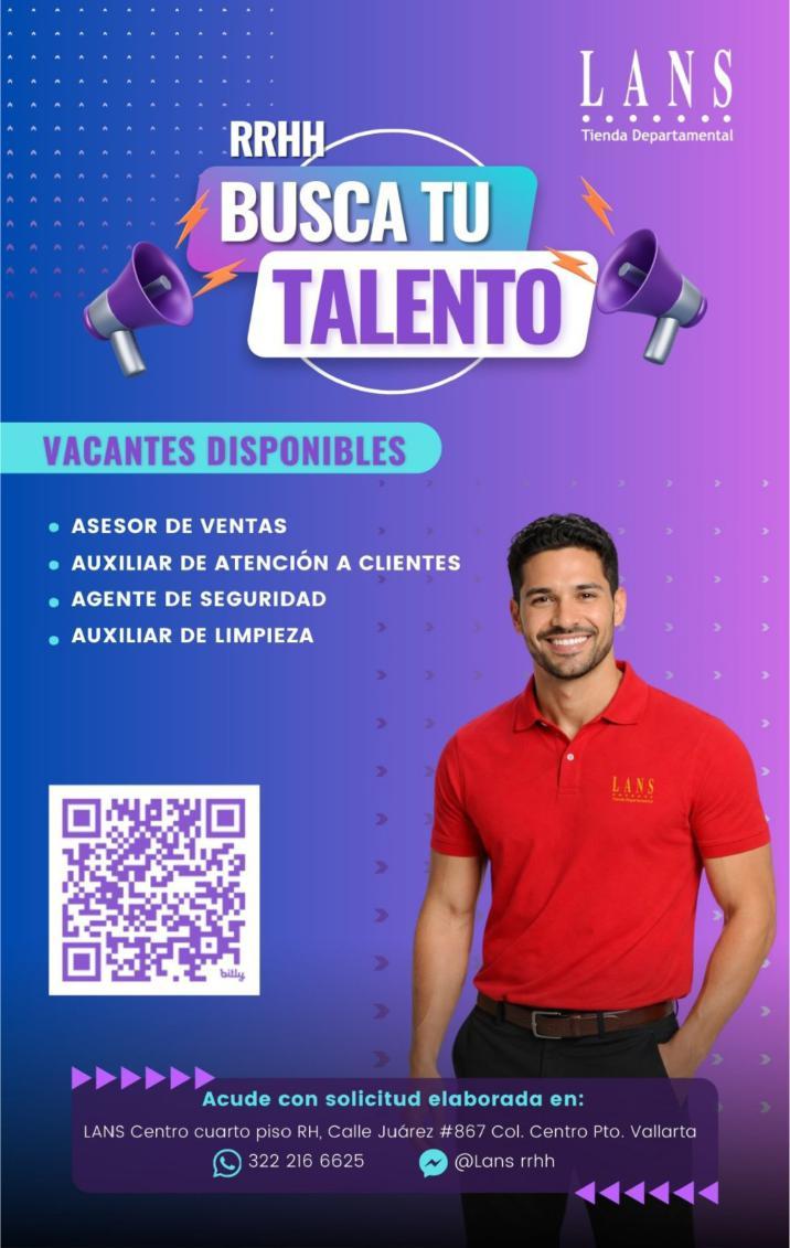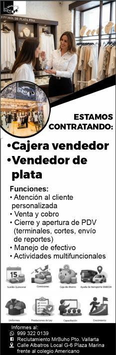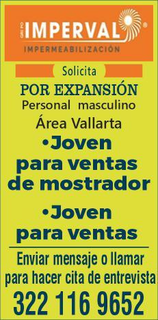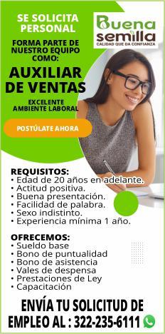 Solicitamos asesor de ventas, agente de seguridad y auxiliar de limpieza. Pide cita al tel. 322 21 666-26.+