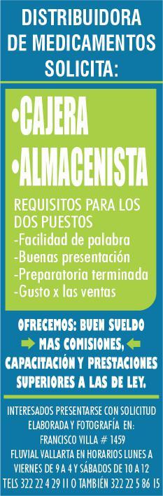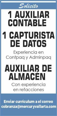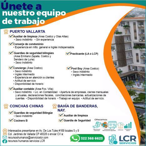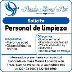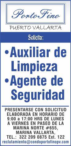 tivo, auxiliar administrativo operativo y personal de limpieza, mayor de edad y disponibilidad de horario. Interesados llamar al tel. 322 18 374-83.+