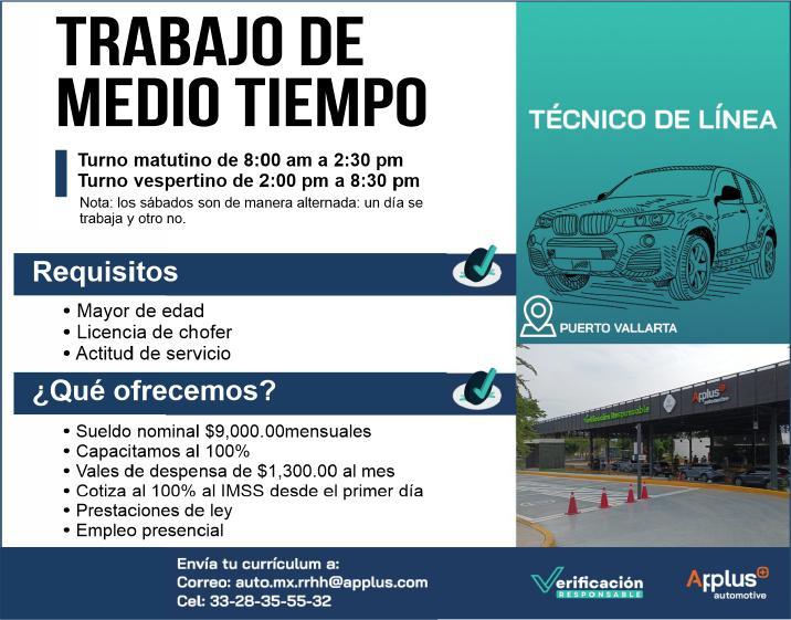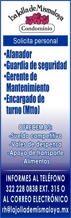 to: Experiencia en el puesto, conocimientos de plomería, pintura y electricidad, disponibilidad de horario. Mayores informes al. 322 16 980-01.+