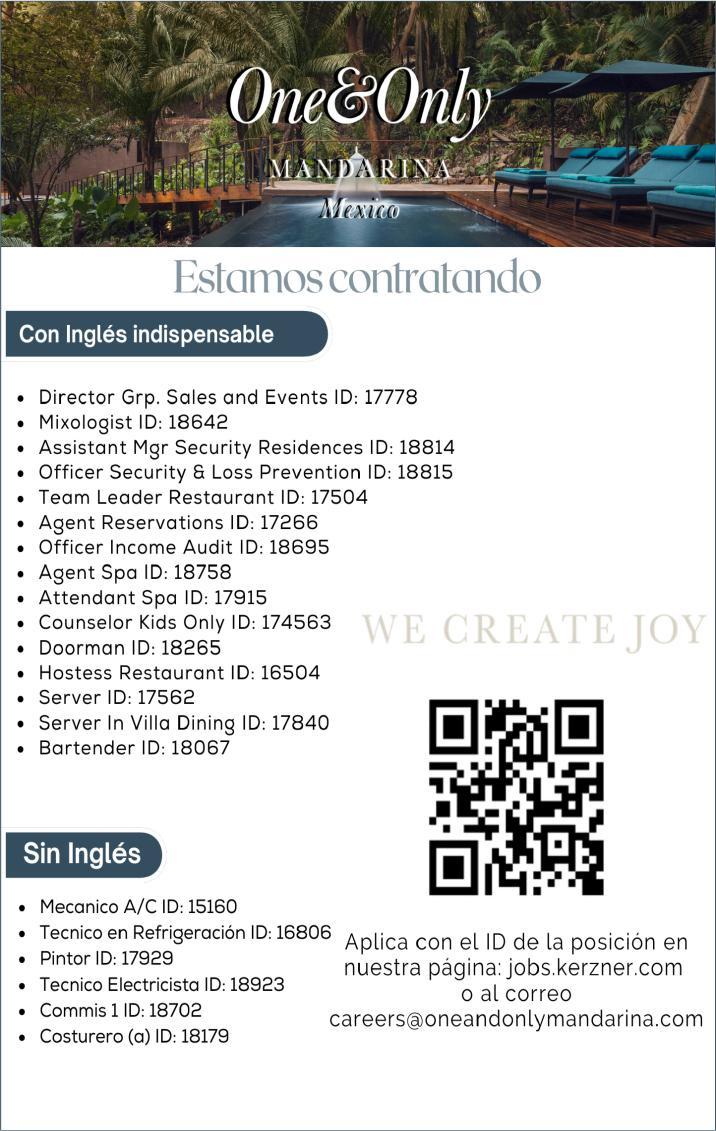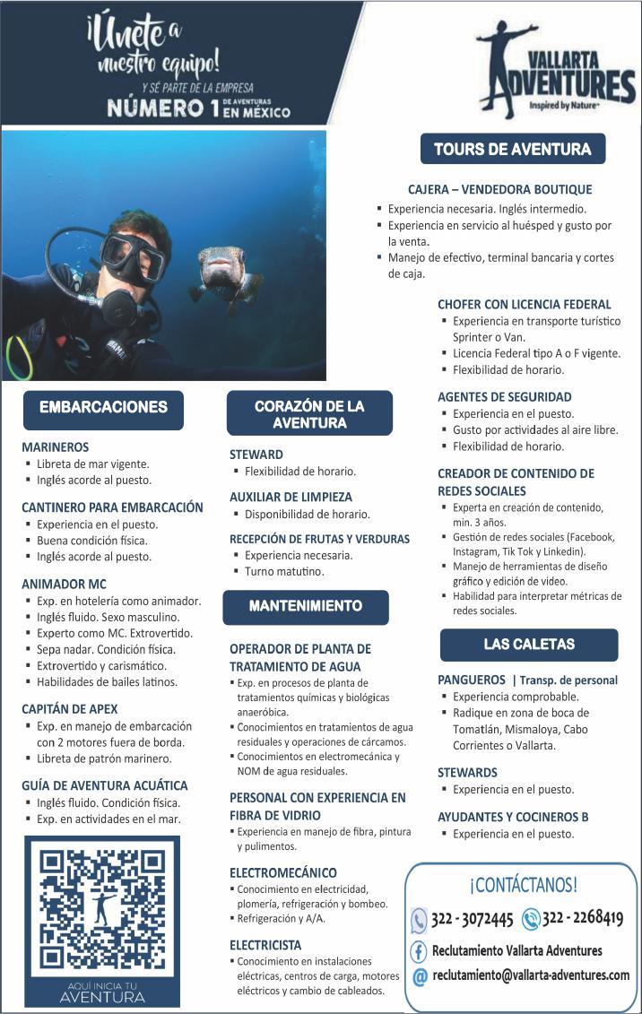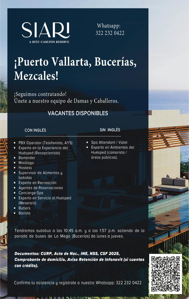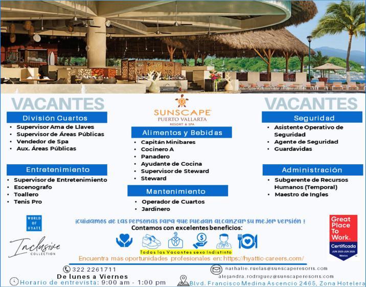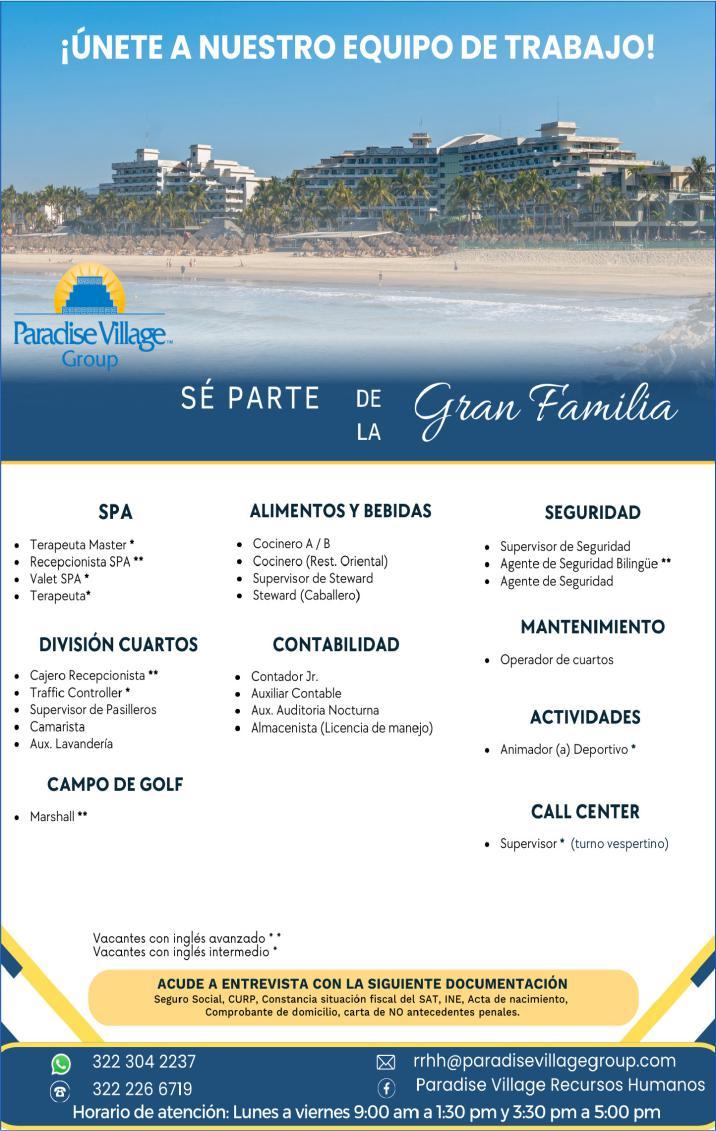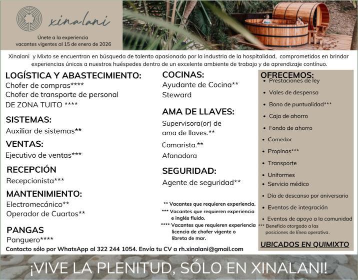 ¡Necesitamos tu experiencia! En Punta de Mita. Vacantes: Agente de Seguridad, Auxiliar de Electricidad, Auxiliar de Limpieza, Alberquero. Agenda entrevista al. 329 29 168-84 ext.