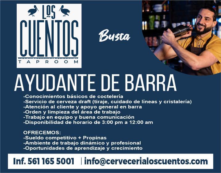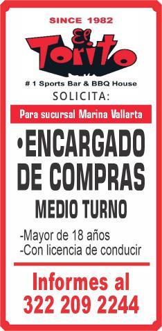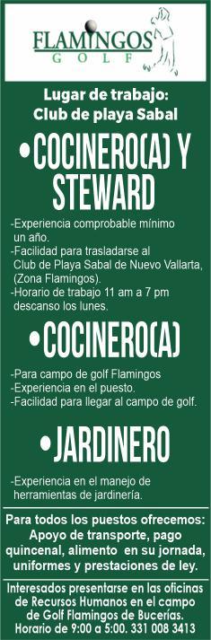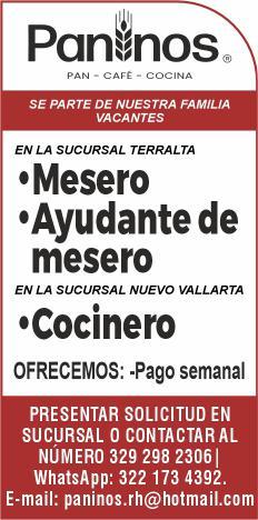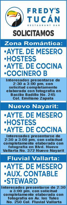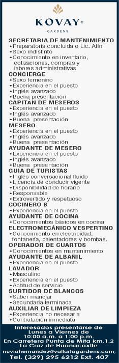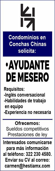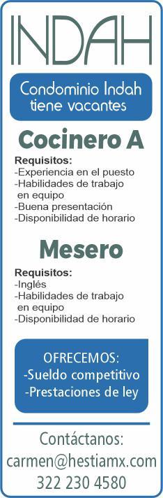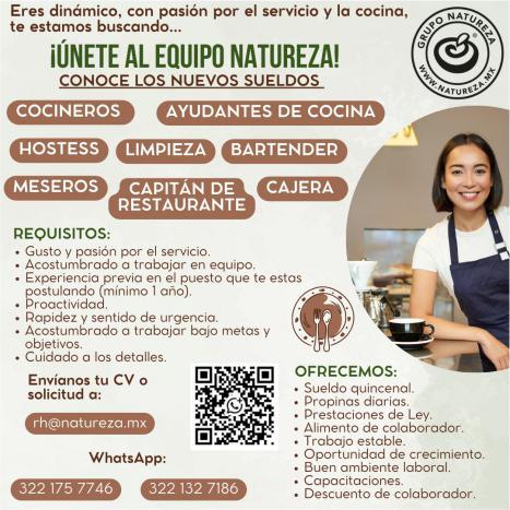 de bar, ayte. de cocina, cocinero y hostess. Solo llamadas de 9:00 am a 6:00 pm, no mensajes. 322 13 191-61.+