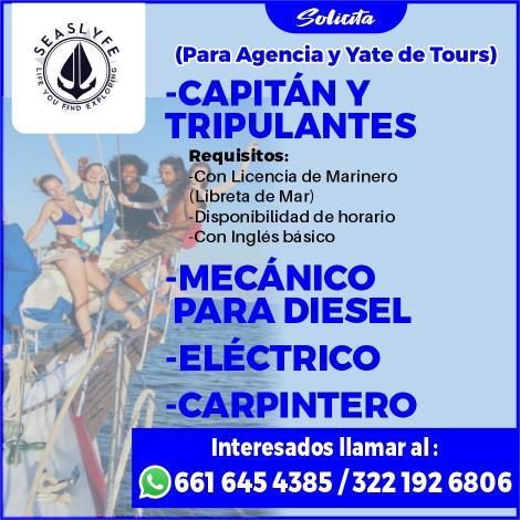 Solicito capitán y tripulantes, con licencia de marinero, libreta de mar, disponibilidad de horario, con inglés básico. Inf. 661 64 543-85, 322 19 268-06.+