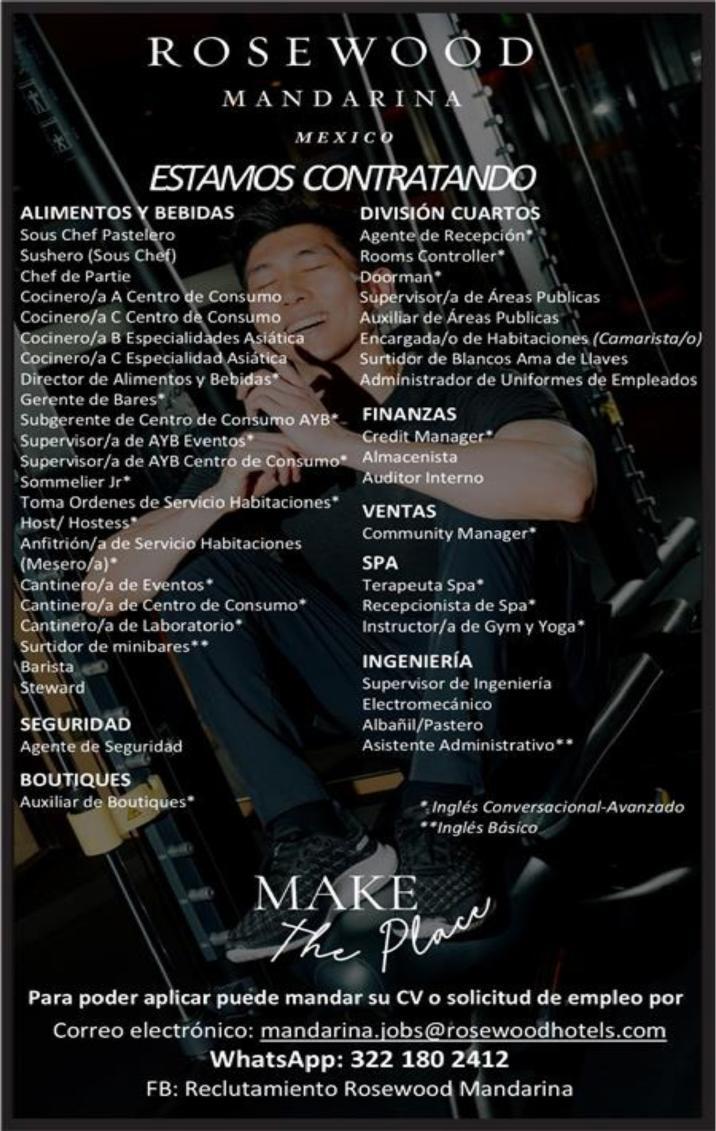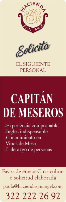 Importante hotel busca capitán de meseros con inglés. WhatsApp. 334 87 107-01.+