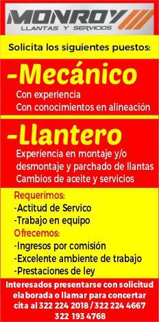 Solicito mecánico con experiencia y con conocimientos en alineación, con actitud de servicio y trabajo en equipo, prestaciones de ley. Inf. 322 22 420-18.+