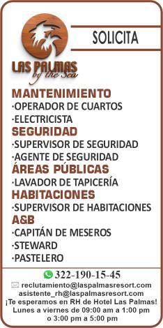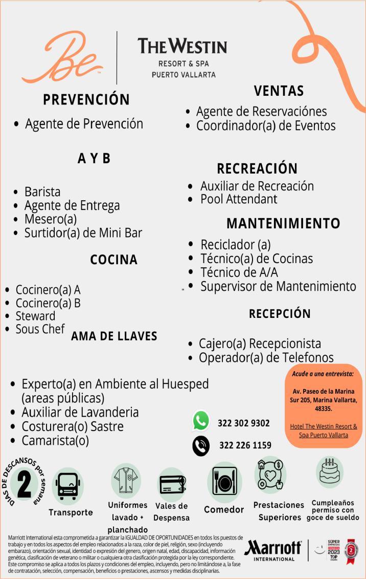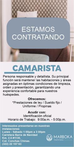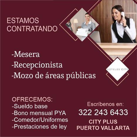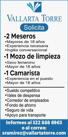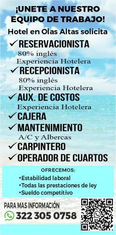 Estamos contratando mesero, camarista, mozo de limpieza. Informes al tel. 322 88 869-63.+