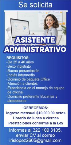 Buscamos Asistente Administrativo: de 25 a 40 años, sexo indistinto, inglés intermedio, dominio de paquete office, atención a clientes, preferentemente viva en Bucerías o al-