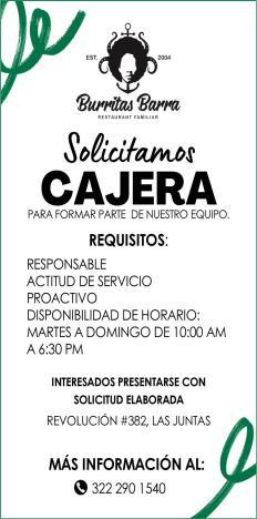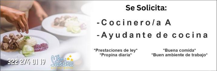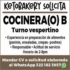 Solicita cocinera (o) B para turno vespertino. Mandar CV o solicitud elaborada al whatsApp. 322 18 239-57.+