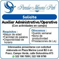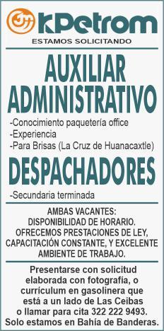 Solicitamos auxiliar administrativo, auxiliar administrativo operativo y personal de limpieza, mayor de edad y disponibilidad de horario. Interesados llamar al tel. 322 18 374-83.+