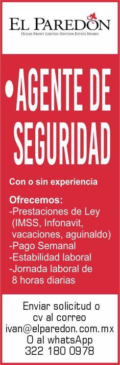 ¡Necesitamos tu experiencia! En Punta de Mita. Vacantes: Agente de Seguridad, Auxiliar de Electricidad, Auxiliar de Limpieza, Alberquero. Agenda entrevista al. 329 29 168-84 ext. 115, 322 13 575-97.+