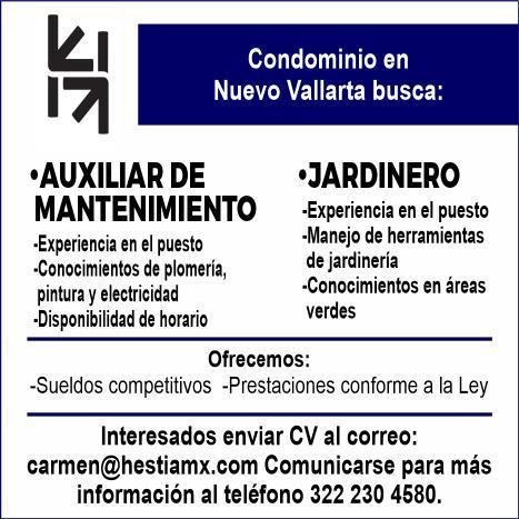 Condominio en Nuevo Vallarta busca Auxiliar de Mantenimiento: Experiencia en el puesto, conocimientos de plomería, pintura y electricidad, disponibilidad de horario. Mayores informes al. 322 16 980-01.+