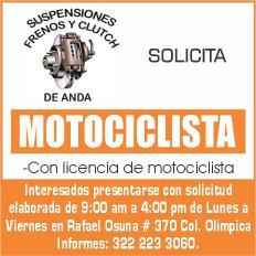 Buscamos motociclista con licencia. Presentar solicitud elaborada de 9:00 a 4:00 pm de lunes a viernes en Rafael Osuna # 370 col. Olímpica.