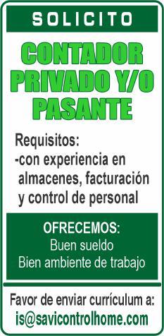 Solicito contador privado con experiencia. Enviar CV a is@ savicontrolhome.com