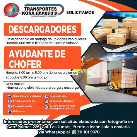 Solicitamos descargadores y ayudantes de chofer, con disponibilidad de horario de lun a vie de 8 a 5 y sábado de 8 a 4 pm, buena condición para carga y descarga. Inf. 311 10 199-70.+
