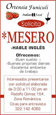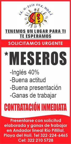 Se solicita urgente meseros, ayudantes de meseros, ayte. de bar, ayte. de cocina, cocinero y hostess. Solo llamadas de 9:00 am a 6:00 pm, no mensajes. 322 13 191-61.+