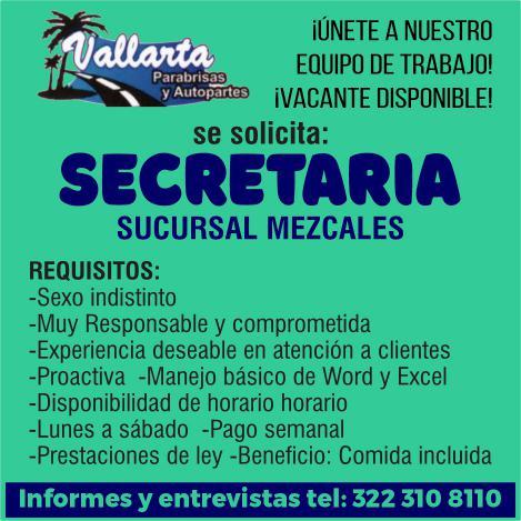 Solicitamos secretaria para sucursal en Mezcales, manejo básico de Word y Excel, disponibilidad de horario. Informes y entrevistas al tel. 322 31 08110.+