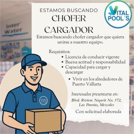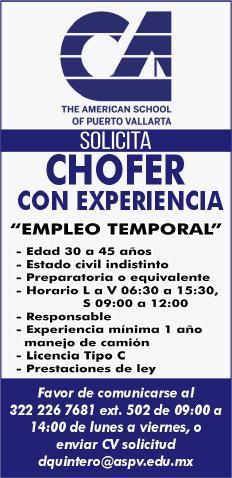 C, experiencia manejando camión, preparatoria mínima o equivalente. Interesados llamar en un horario de 9am a 2pm al tel. 322 22 676-81, ext. 502 .+