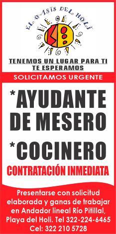 Solicitamos urgente ayudante de mesero y cocinero. Contratación inmediata. Informes. 322 21 057-28.+