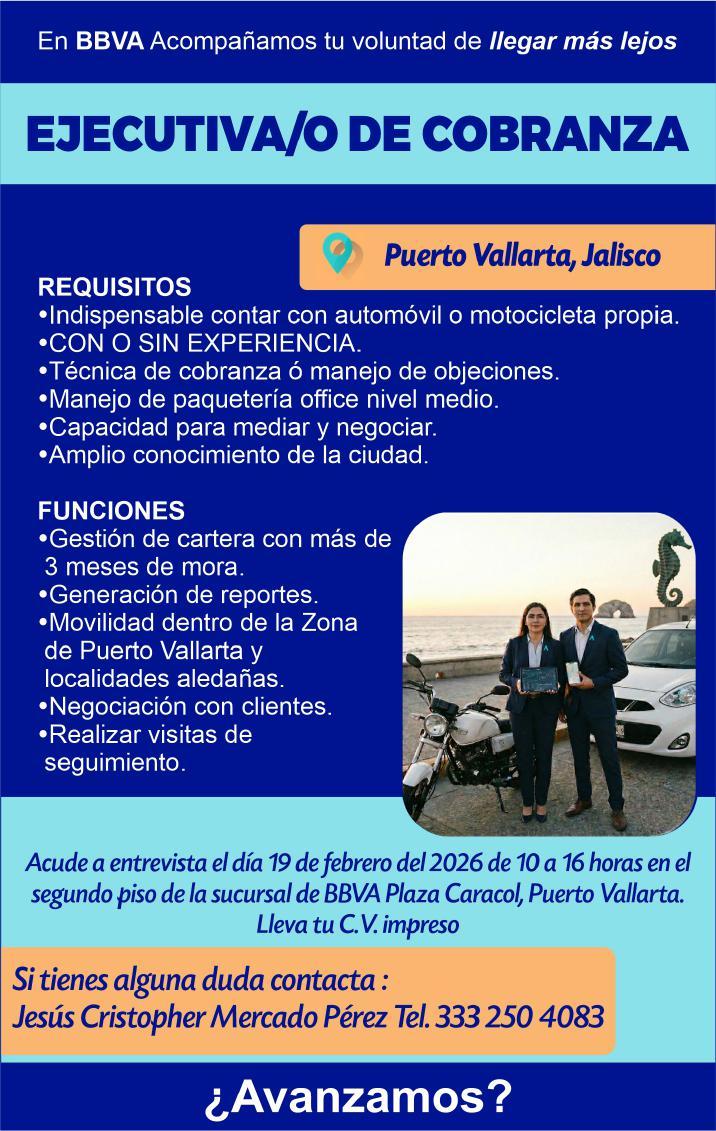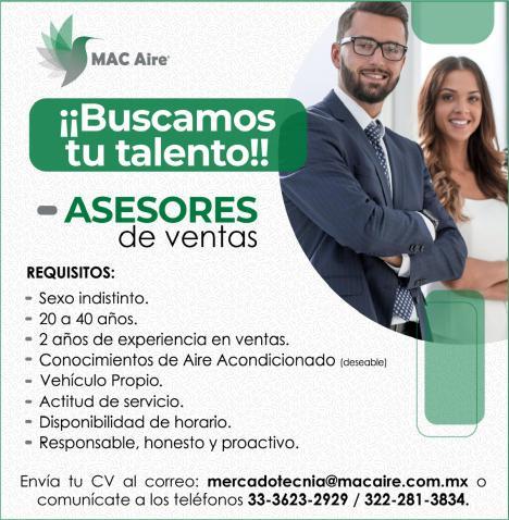 Solicitamos asesor de ventas, agente de seguridad y auxiliar de limpieza. Pide cita al tel. 322 21 666-26.+