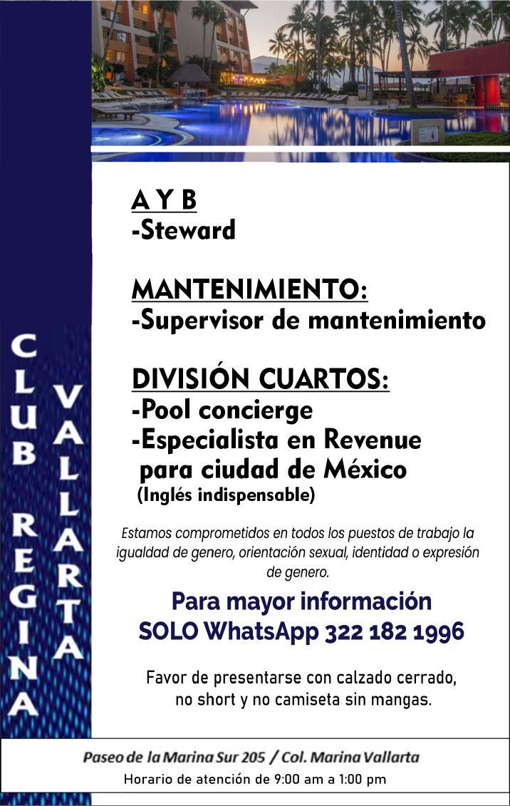 Área de Nuevo Vallarta, solicitamos ayudante de mantenimiento, aux. de almacén, steward, mesero. Presentar solicitud elaborada. Inf. 322 29 704-03.+