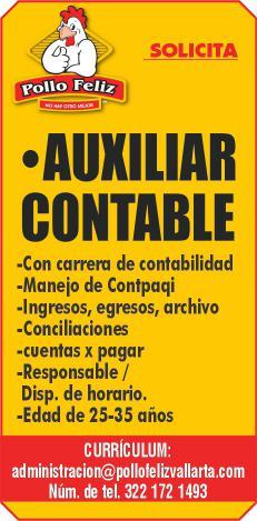 Solicita contador (a), licenciatura concluida y vivir en Puerto Vallarta. Llamar al tel. 331 06 360-65.+