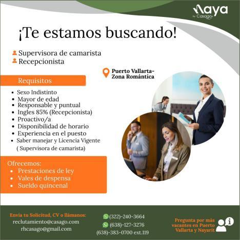 Estamos buscando recepcionista con inglés, sexo indistinto. Informes al. 322 19 109-68.+