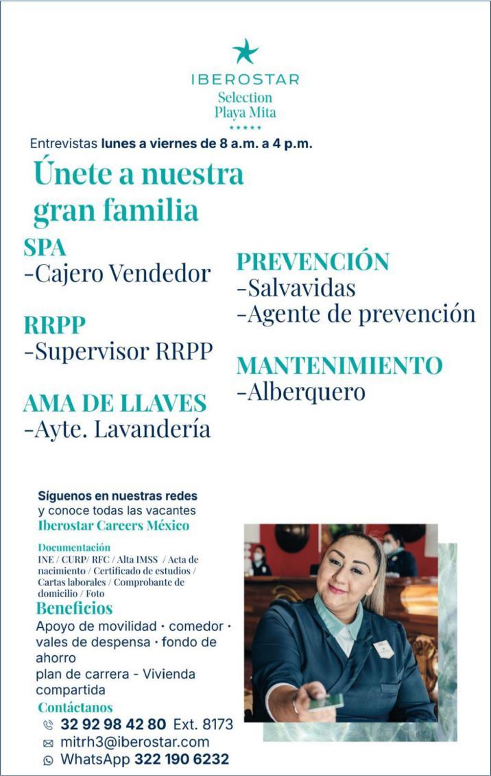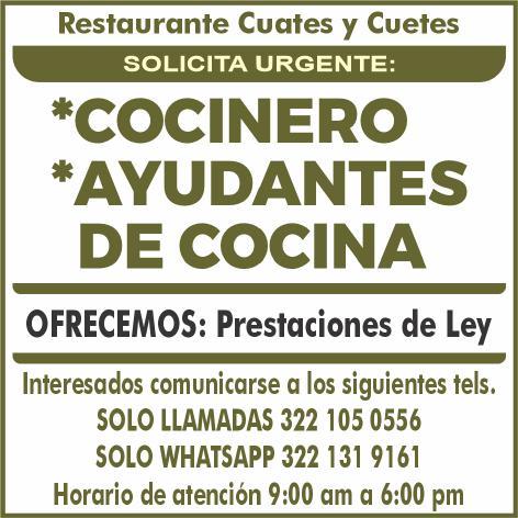 cocina, cocinero, persona para inventarios y almacén. Solo llamadas de 9:00 am a 6:00 pm, no mensajes al. 322 13 19161.+
