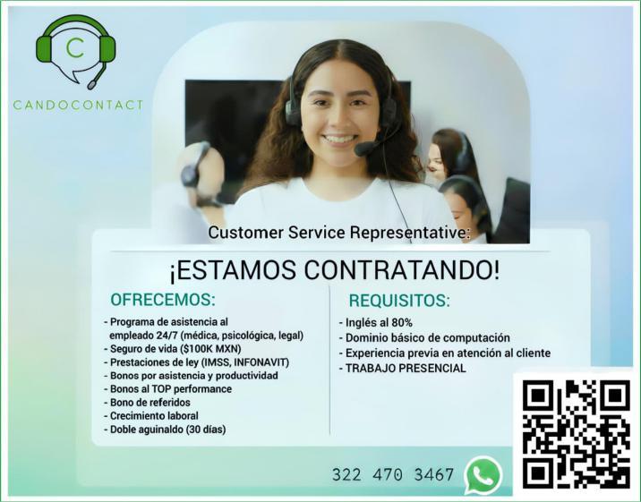 Solicitamos costumer service representative, inglés 80%, dominio básico de computación, experiencia en atención al cliente, trabajo presencial. Tel. 322 47 034-67.+