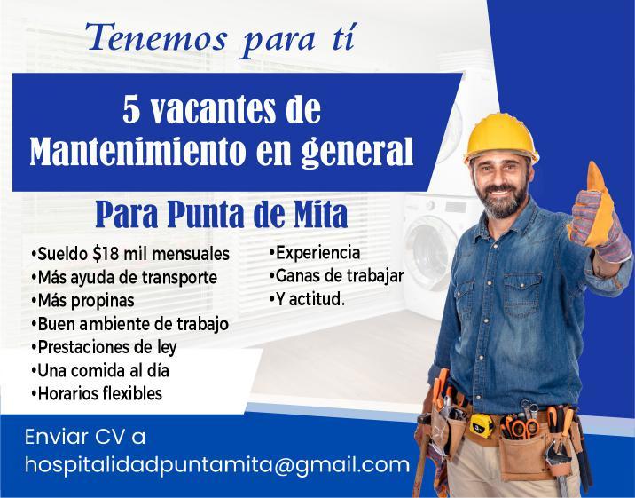 Tenemos para ti 5 vacantes de mantenimiento en general para Punta Mita. Enviar CV a hospitalidadpuntamita@gmail.com