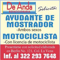 nanciamiento, técnico, lavador pulidor, hojalatero y office boy. Informes al tel. 322 22 619-99.+