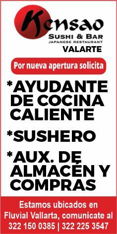 Estamos contratando, ayudante de cocina caliente, sushero, aux. de almacén y compras. Informes. 322 15 003-85, 322 22 535-47.+