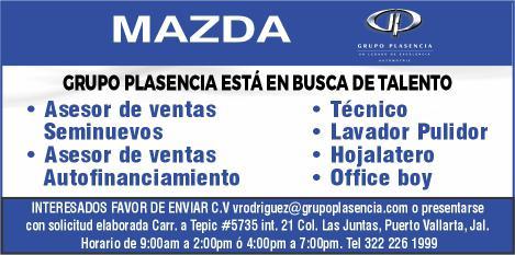 Grupo Plasencia: Solicitamos asesor de ventas en seminuevos, asesor de ventas autofinanciamiento, técnico, lavador pulidor, hojalatero y office boy. Informes al tel. 322 22 619-99.+