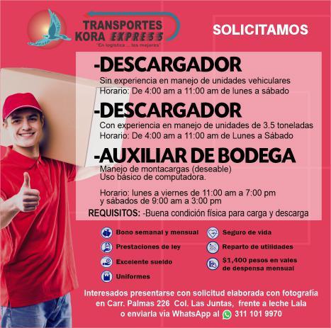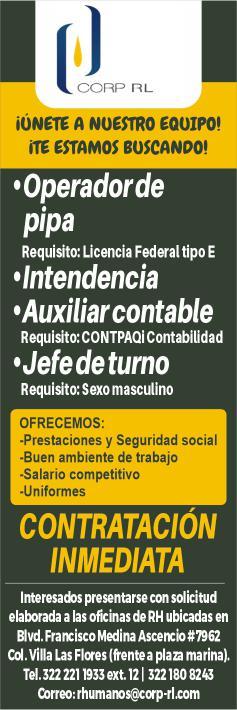 Solicita auxiliar contable, despachador, operador de pipa, jefe de turno, intendencia. Contratación inmediata. Tel. 322 22 119-33.+