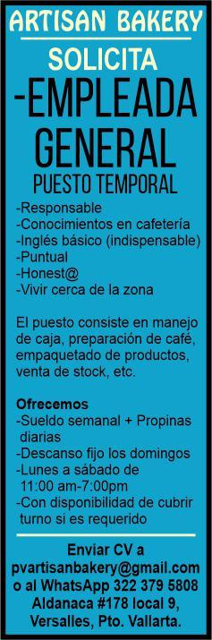 Se solicita empleada general, responsable e inglés básico indispensable. Interesados enviar cv a. 322 37 958-08.+